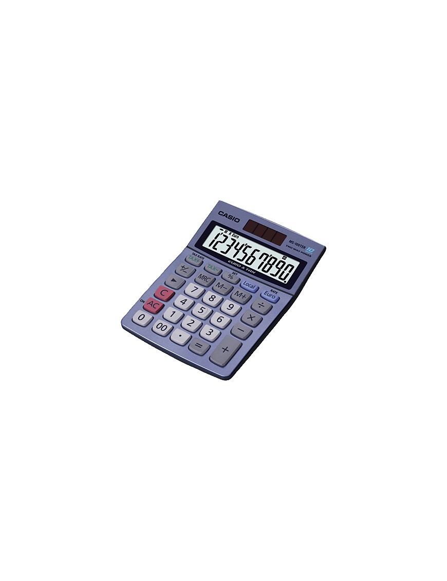 CASIO Calculadora sobremesa MS-80VER-100/120 TER 10 digitos Solar /pilas MS-100TERII Cód artículo: 229115 10 Dígitos.Función de conversión a Euro. Porcentaje. Cálculos con tasas (MS-100 TER y MS-120 TER). Teclas en formato grande. Alimentación dual: solar y pilas (1 pila LR54 incluida). Dimensiones: 13.7 x 10.3 x 3.1 cm. Peso: 115 g.