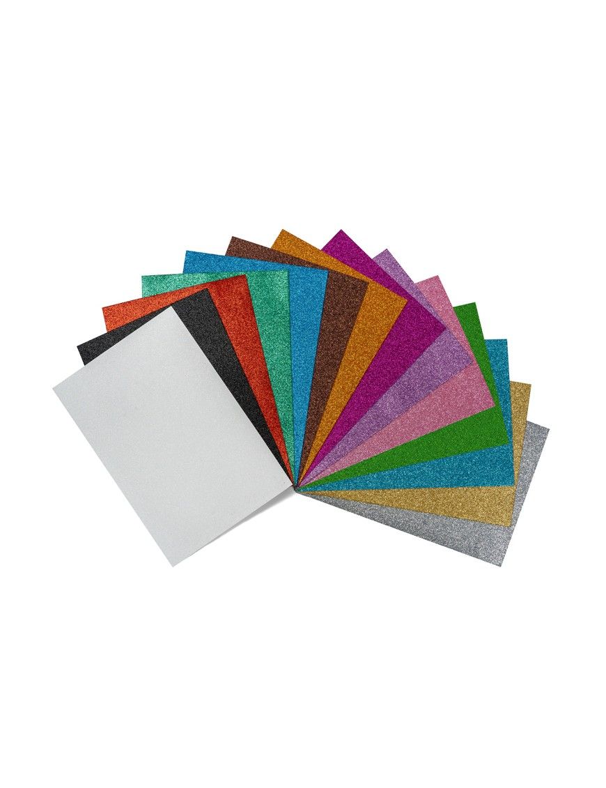 Hojas en EVA para trabajos manuales acabado purpurina. Bolsa 3 láminas unicolor. Medidas: 400x600x2 mm. de espesor.100% Reciclable U/c: 12 bolsas.Colores: blanco 01, negro 02, rojo 03, verde oscuro 04, azul oscuro 07, marrón 09, naranja 11, fucsia 12, violeta 27, rosa 29, verde claro 35, azul claro 47, oro 90, plata 91.